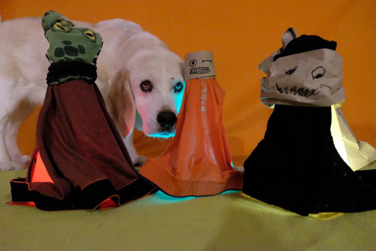 Ist das nicht irgendwie gruselig? Auf jeden Fall! Probiert zum Beispiel zur Einstimmung unsere beleuchteten Halloween-Schlüpper-Geister aus: Die sind erst tolles Erkundungs-Hunde-Enrichment, und dann taugen sie sogar als jahreszeitliche Deko für die Wohnung (also bei uns zumindest). Dafür einfach einen bunten Becher, ein Markierhütchen oder ähnliches nehmen, Unterhose umgekehrt drüberhängen, Gesicht aus Packpapier oder Papprolle kreieren, LED-Licht drunter, fertig.- Und was ist mit der Hygiene? Naja, das ist wie mit den Hundedecken: Nach 60 Grad und mehr in der Waschmaschine ist alles lupenrein und gut verwendbar.