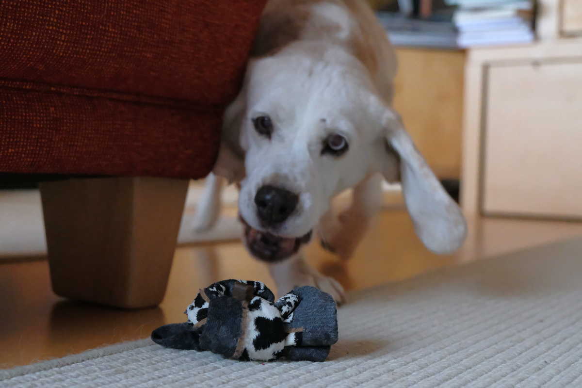 - Schritt 3: Wie Schritt 2, allerdings wird die Socke nun – vor den Augen des wartenden und zuschauenden Hundes – in ganz einfachen “Verstecken” verborgen, beispielweise hinter einem Stuhlbein, neben einem Möbelstück, so dass der Socken beim Loslaufen nicht sofort sichtbar ist. Lernziel: Ein wenig nach der Socke Ausschau halten lohnt sich!