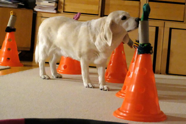 So that we don’t run out of ideas, we play with everyday experiences. And now it’s the Olympics! After we celebrated a „torch relay“ at the opening ceremony yesterday, we had the idea: For 14 days we play through the winter sports. For each of them, a playground for the senses is created in the living room or another dog-friendly living room game.