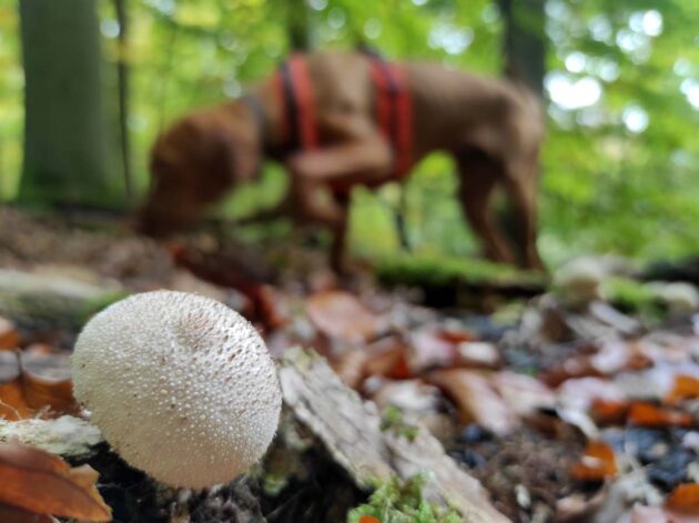 Hund-Pilz-Fotos, das ist Beschäftigung für Zwei- und Vierbeiner zugleich. Wir streifen gemeinsam jenseits der Weg durchs Gelände – bestes Fitnesstraining für alle Beteiligten. Erst recht, wenn wir Menschen dann auf Pilzhöhe runter müssen. Die Hunde genießen in dieser Zeit ein Lieblingshundehobby: das Futterschnüffeln! Das entspannt, entschleunigt und macht Spaß. Am besten, Sie verwenden dafür direkt einen Teil der Futter-Tagesration.