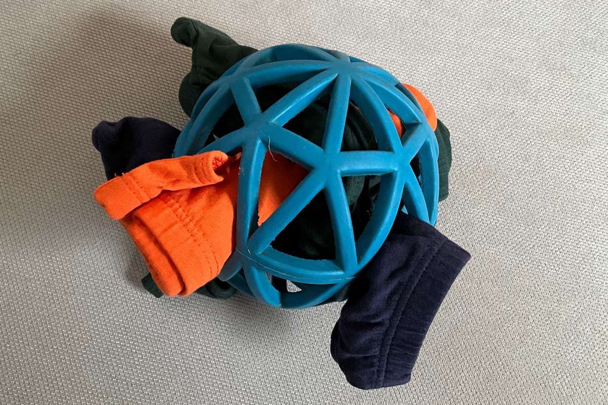 Gitterbälle sind einfach genial. Man kann sie mit allem Möglichen füllen – natürlich auch mit … Schlüppern! Zusammengerollt, zusammengelegt, zusammengefaltet – all das geht. Das Schöne an den Schlüppern: Durch ihre Zweilagigkeit und taschenartige Struktur kann das Futter (auch) in ihnen versteckt werden, so dass es beim Herausziehen der Schlüpper nicht direkt herausfällt, sondern erst noch herausgearbeitet werden muss. Vielen Dank an unsere Schlüppermania-Stars Cara und Mara, die diese Idee bespielt haben!