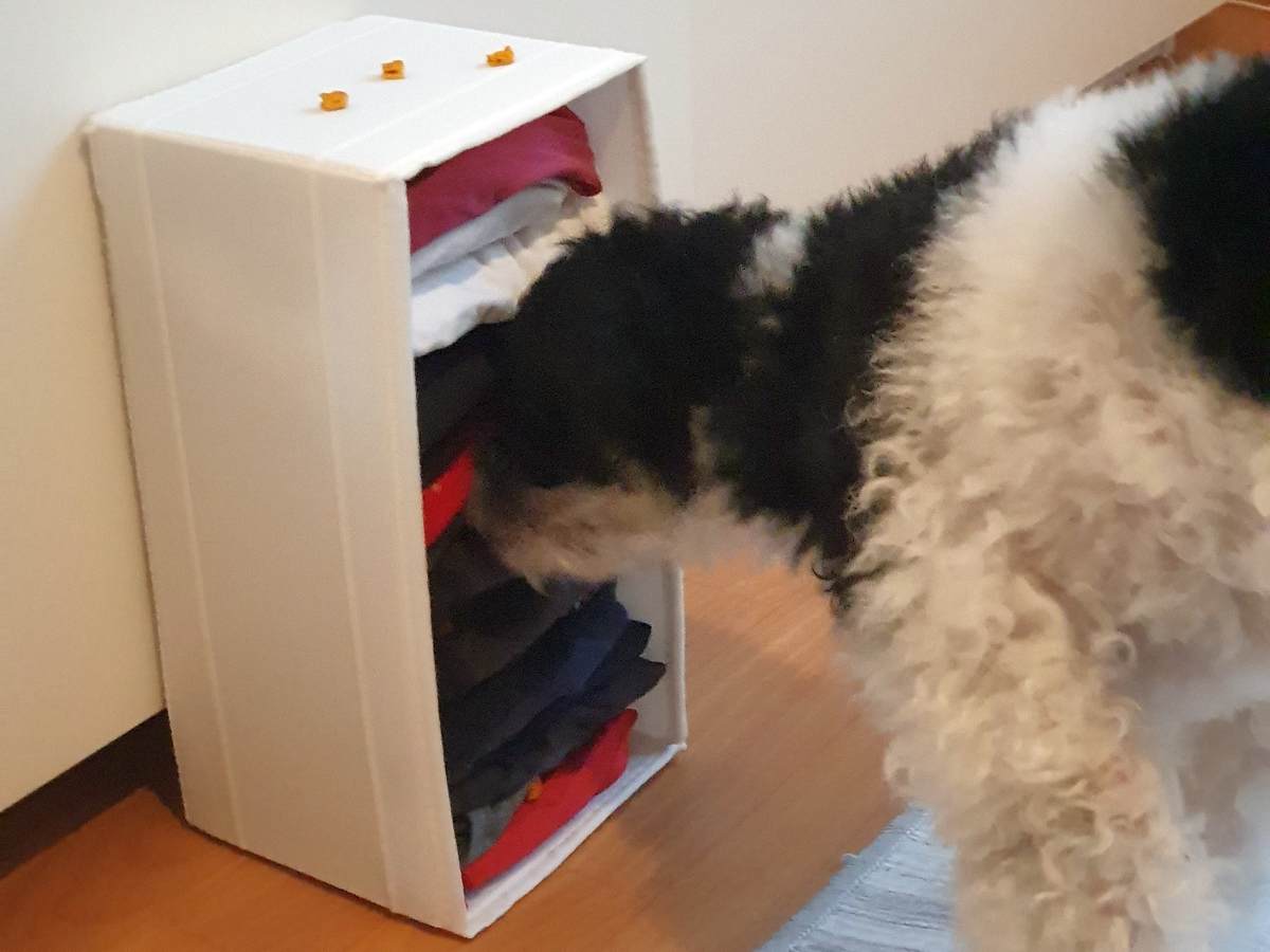 - Anschließend das gepackte „Wäschefach“ aufrecht hingestellt oder mit der Öffnung nach oben dem Hund präsentieren. Ggf. gegen Verrutschen festhalten, während der Hund zu Werke geht.