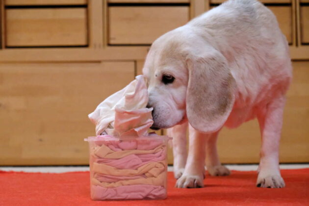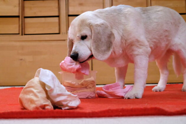 - Dann darf der Hund: Schnüffeln, Wühlen, Herausnehmen, Auspacken, heißt die Devise!