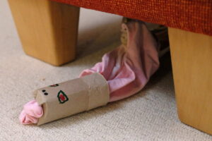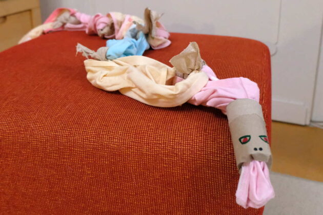 - Schlange mit Futter bestücken, ggf. Schlüpfer noch etwas verdrehen, verknoten etc., damit das Futter nicht zu schnell heraus fällt.