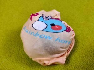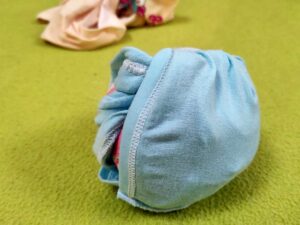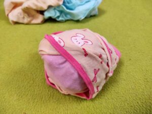 - Den ersten Schlüpper zu einer Kugel zusammenlegen oder zusammenknoten. Futterbröckchen mit einarbeiten.