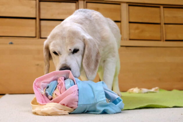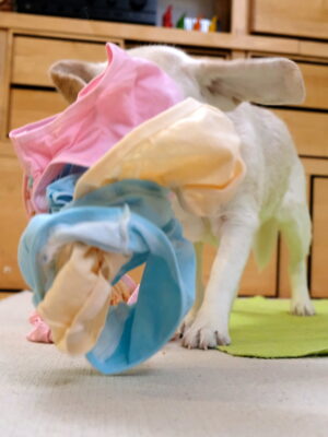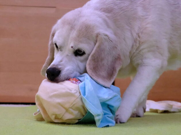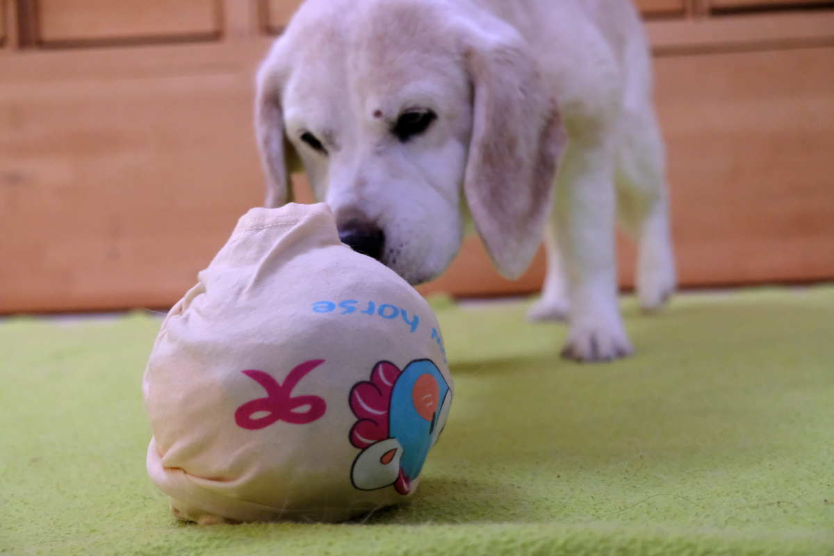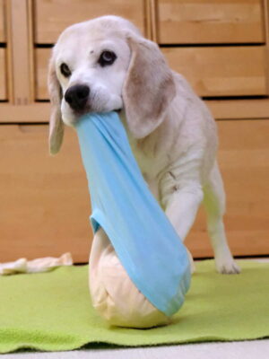 Aus dem prallen Ball mit straff gezogenen Schlüpperschichten das Futter herauszuarbeiten, erfordert einiges an Energie und Durchhaltevermögen. Damit alle Hunde damit klar kommen, gilt: Je unerfahrener der Hund im Herausarbeiten und Auspacken von Futter, desto lockerer sollte der „Ball“ zunächst ausfallen.