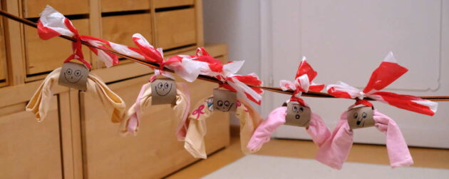 - An jedem Schlüpperling ein Stück Band befestigen und den Schlüpperling anschließend an der Leine oder der Stange aufhängen.