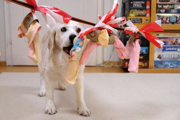 - Als Erstes einen sicheren Ort zum Spannen der Leine suchen: Die Leine kann beispielsweise zwischen zwei absolut standfesten (!) Regalen gespannt werden, von zwei Menschen gehalten werden, oder aber auch mit beiden Händen von einem Menschen. Leine so aufhängen, dass sie etwas über Hundenasenhöhe hängt. Der Vierbeiner sollte später bequem im Stehen und ohne allzu langen Hals erobern können, wenn die Schlüpperlinge herunterhängen.