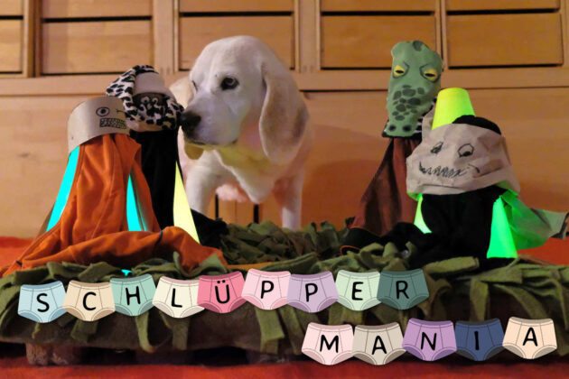 Hier kommt der vermutlich verrückteste Hundespiele-Mitmach-Adventskalender aller Zeiten. Resultierend aus einer Art Wette beim Online-Hundekongress 2024 (liebe Grüße an Dagmar Spillner und Ariane Ullrich). Schaffen wir es, 24 Spielideen rund um das intimste aller Wäschestücke zu kreieren? Weil das Projekt zugegebenermaßen ein bisschen wahnsinnig ist, haben wir es „Schlüppermania“ getauft.